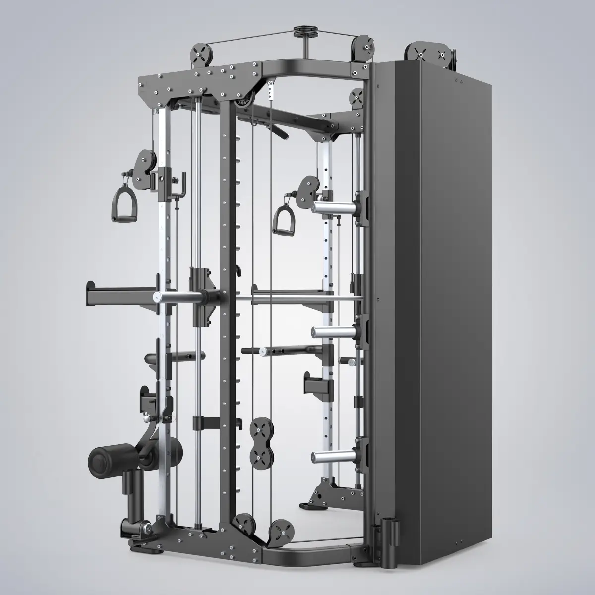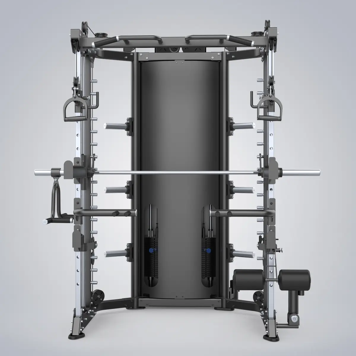 E6247 konzentriert sich auf leistungsstarke Funktionalität und ist ein herausragendes umfassendes Krafttrainingsgerät, das ein Ganzkörpertraining ermöglicht. Sowohl Anfänger als auch erfahrene Trainer können auf diesem Gerät ein großartiges Trainingserlebnis haben. Das Smith-Bar-System bietet ein niedriges Startgewicht, um ein realistischeres Gewichtheber-Erlebnis zu simulieren. Die feste Schiene kann Anfängern helfen, den Körper besser zu stabilisieren und das Training jederzeit zu stoppen und zu beenden. Für erfahrene Trainierende kann es in Kombination mit einer verstellbaren Bank für mehr und sichereres Freihanteltraining genutzt werden. Es ist speziell für Trainingsumgebungen mit begrenztem Platzbedarf konzipiert, um die maximal mögliche Anzahl von beliebten Krafttrainingsarten zu integrieren, und ist somit eine ideale Ausrüstungswahl für kleine Räume.