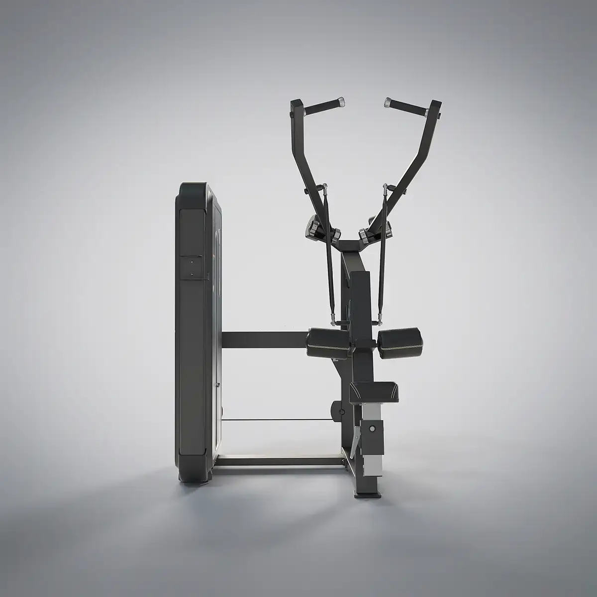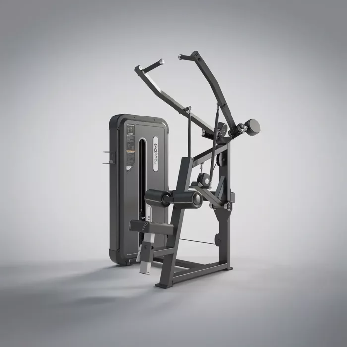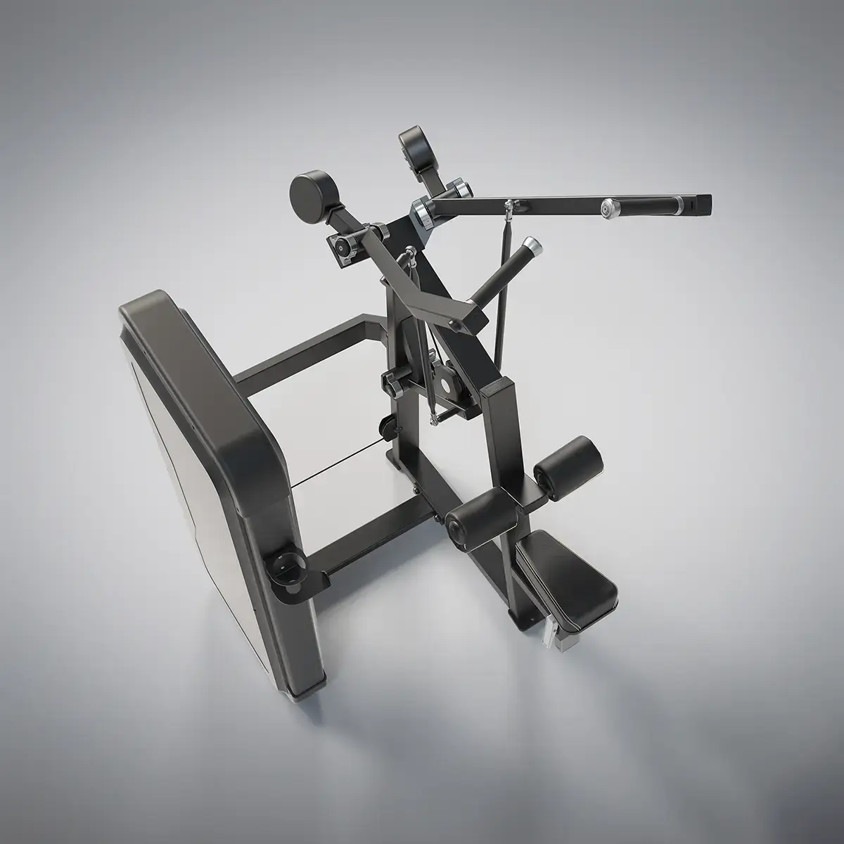 Die leicht nach oben angewinkelte Position des Sitzes sorgt für Stabilität. Bewegungsmuster folgt dem natürlichen Bewegungsablauf. Einzelne, divergierende Gerätearme, sorgen für eine natürliche, nach unten gerichtete Zugbewegung und viel Trainingskomfort. Einstellbares Beinpolster zur Adaption an alle Benutzergrößen.