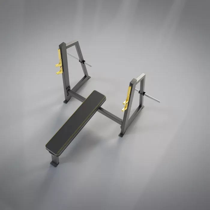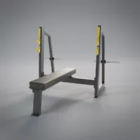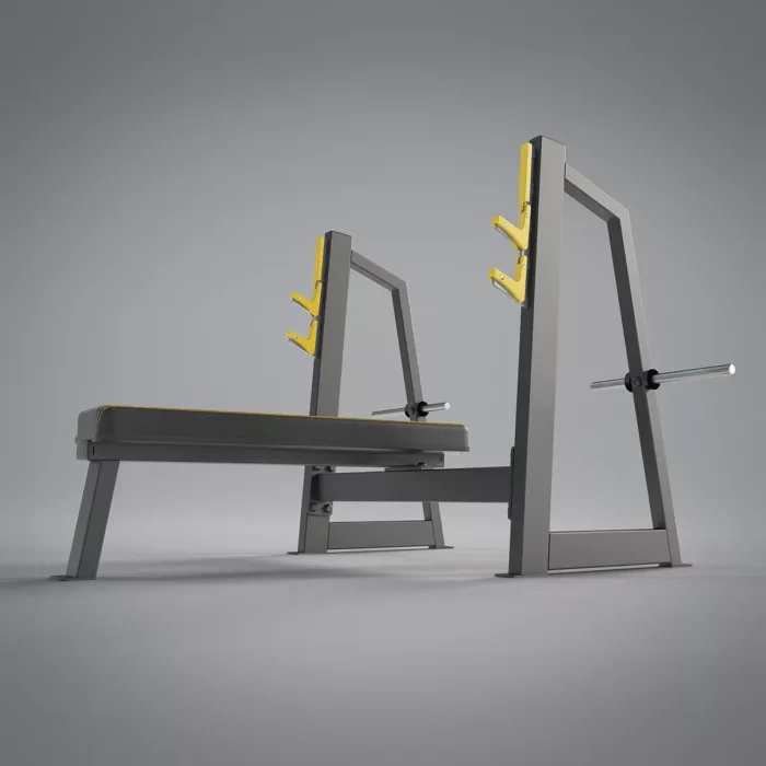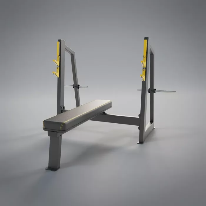Flache Bank mit zwei Aufnahmen für Hantelstange und vier Gewichts Ablagen. Die Polyurethan-Ummantelung vermindert Abnutzung und sorgt für ein